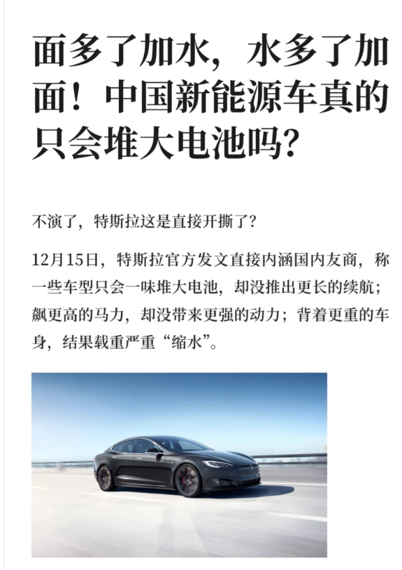 12 月 15 日特斯拉的官方发文,话里话外都在戳一个痛点:有些车型把电池越做越大,车重跟着飙升,结果续航没涨多少,动力响应还变钝了,反而成了 “负重前行”。这话一抛出来,评论区直接炸了:有人觉得 “特斯拉说的是实话,国产续航虚标就是堆电池堆出来的”,也有人怼 “你倒是把电池做大点啊,冬天续航打折的时候别喊冷”。